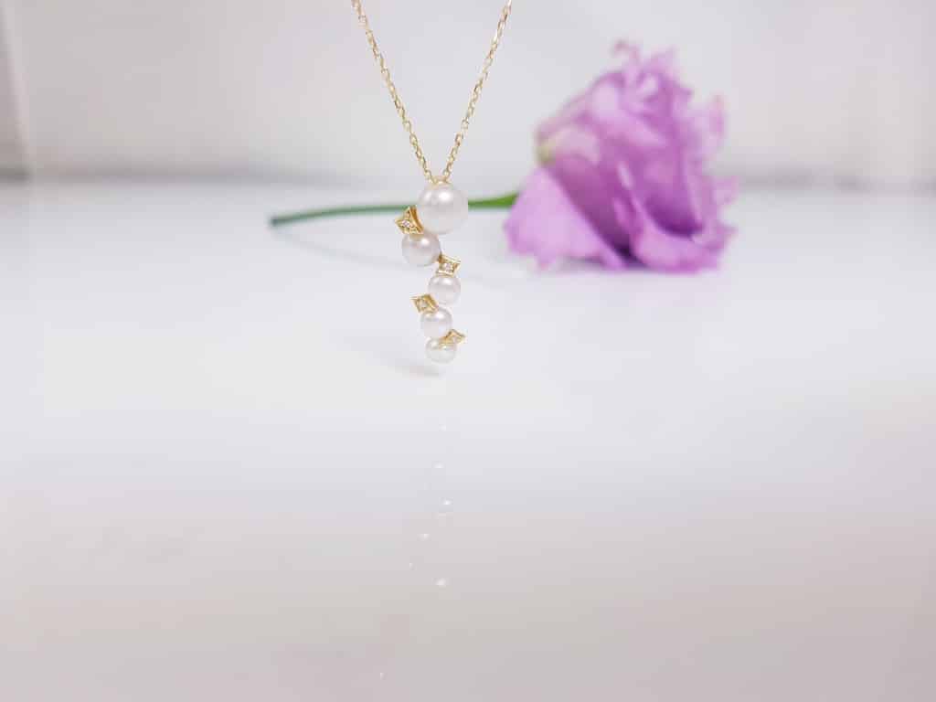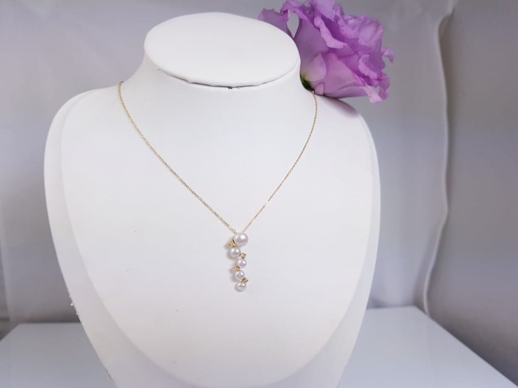 In de ketting zit een 18k gouden hanger met echte parels en echte diamanten.